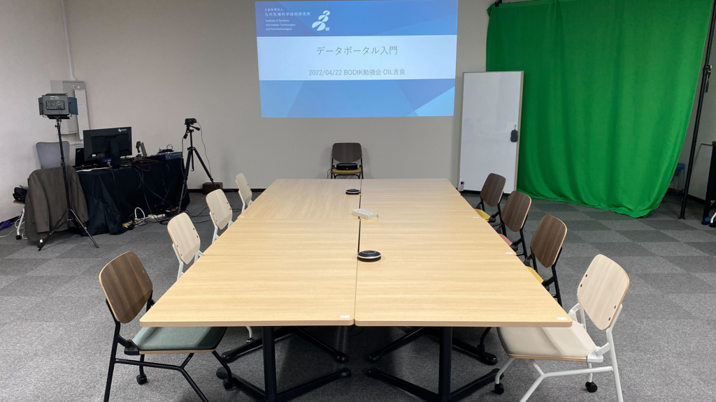 ちなみに会場は、九州先端科学技術研究所のSOILイベントスペースです。こうした勉強会のZoom配信の進め方と工夫については、また別の機会にご紹介したいと思います。