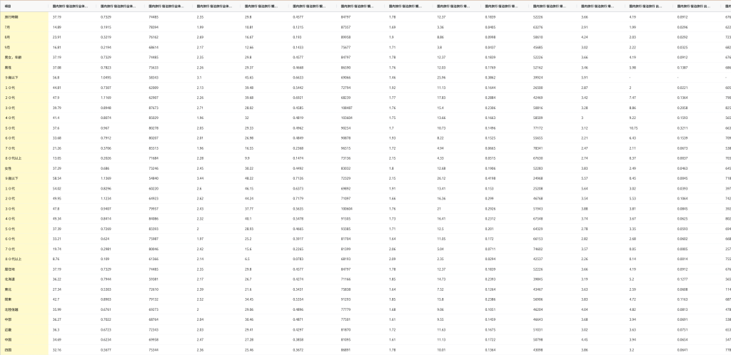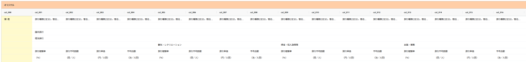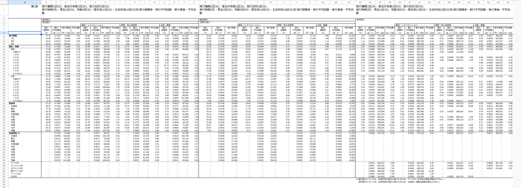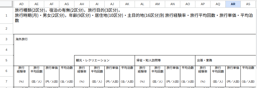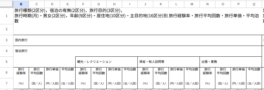 - 6行目は各分類の数値項目(旅行経験率、旅行平均回数、旅行単価、平均泊数)